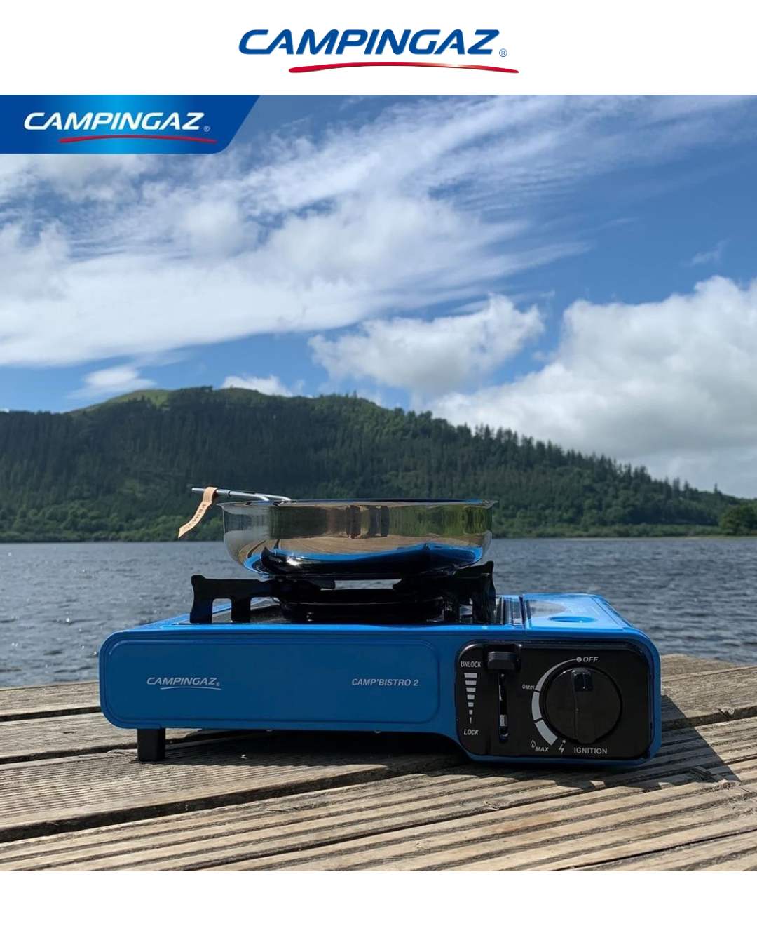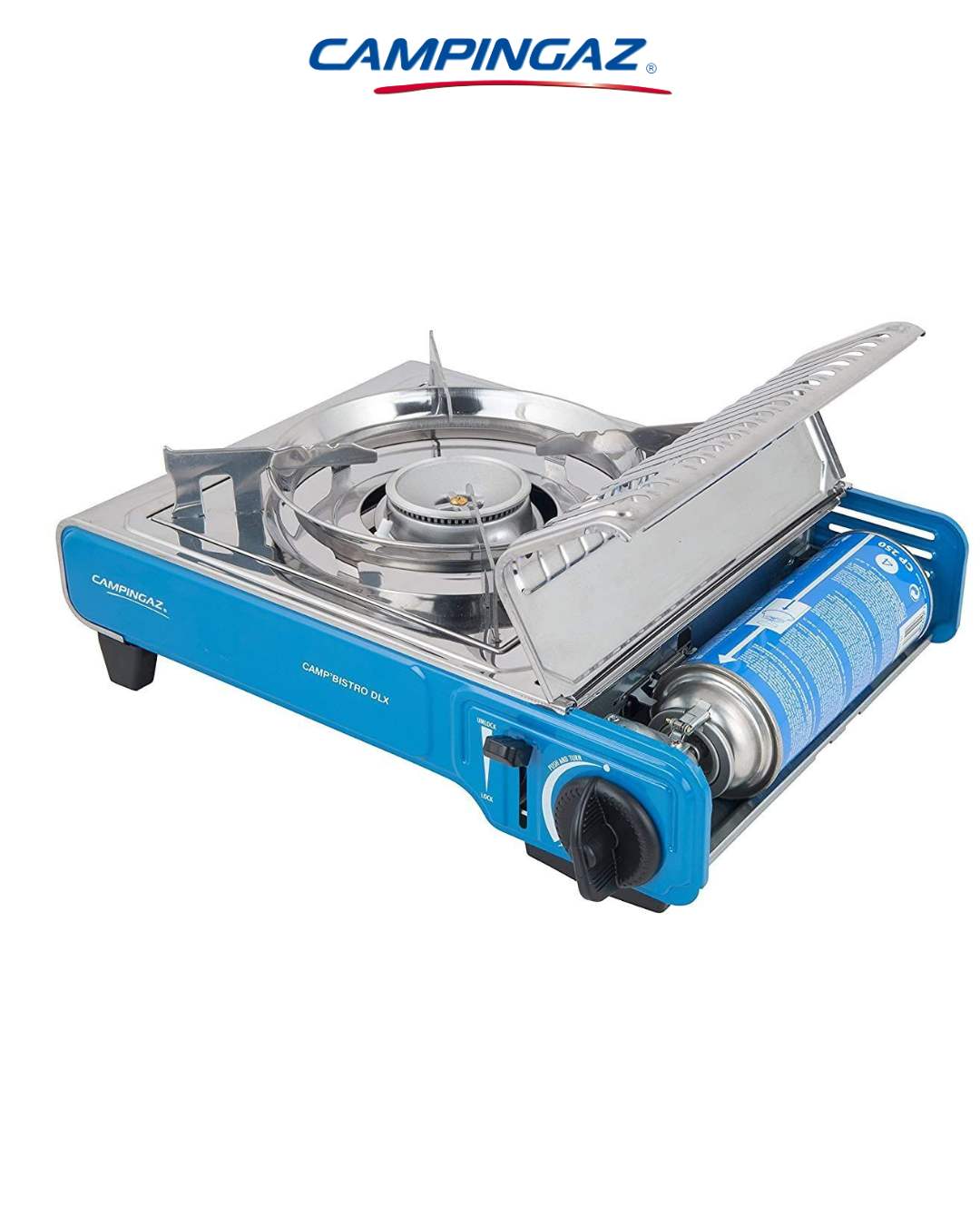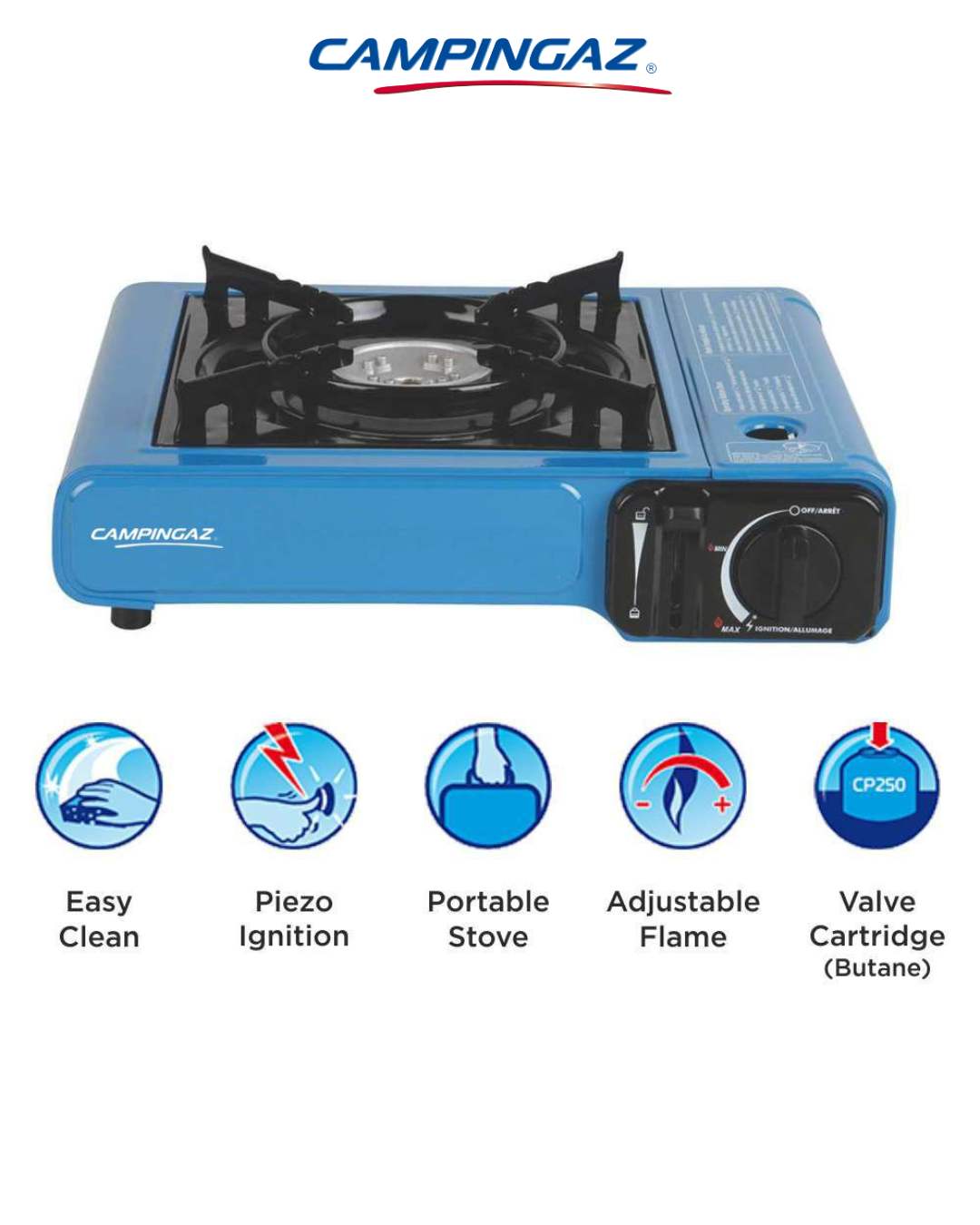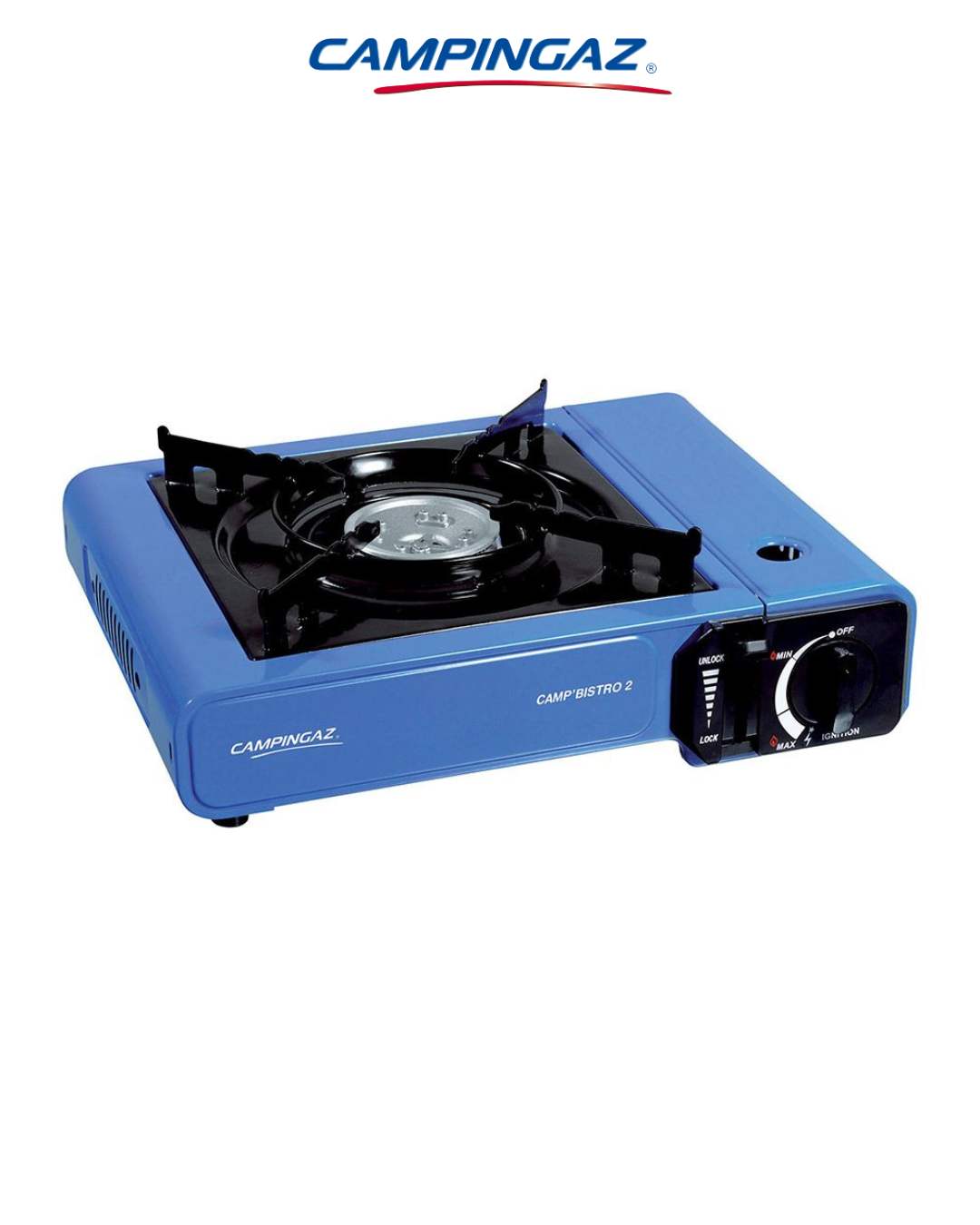 A compact and portable single-burner camping gas stove with reliable piezo ignition, stable enamelled pan support and easy safety-lock cartridge system — perfect for outdoor cooking on camping trips, picnics and adventures.